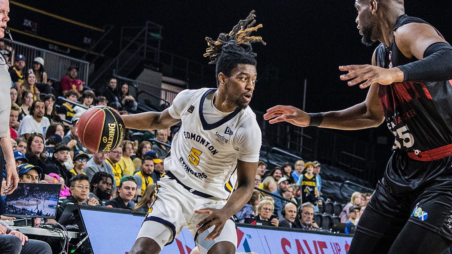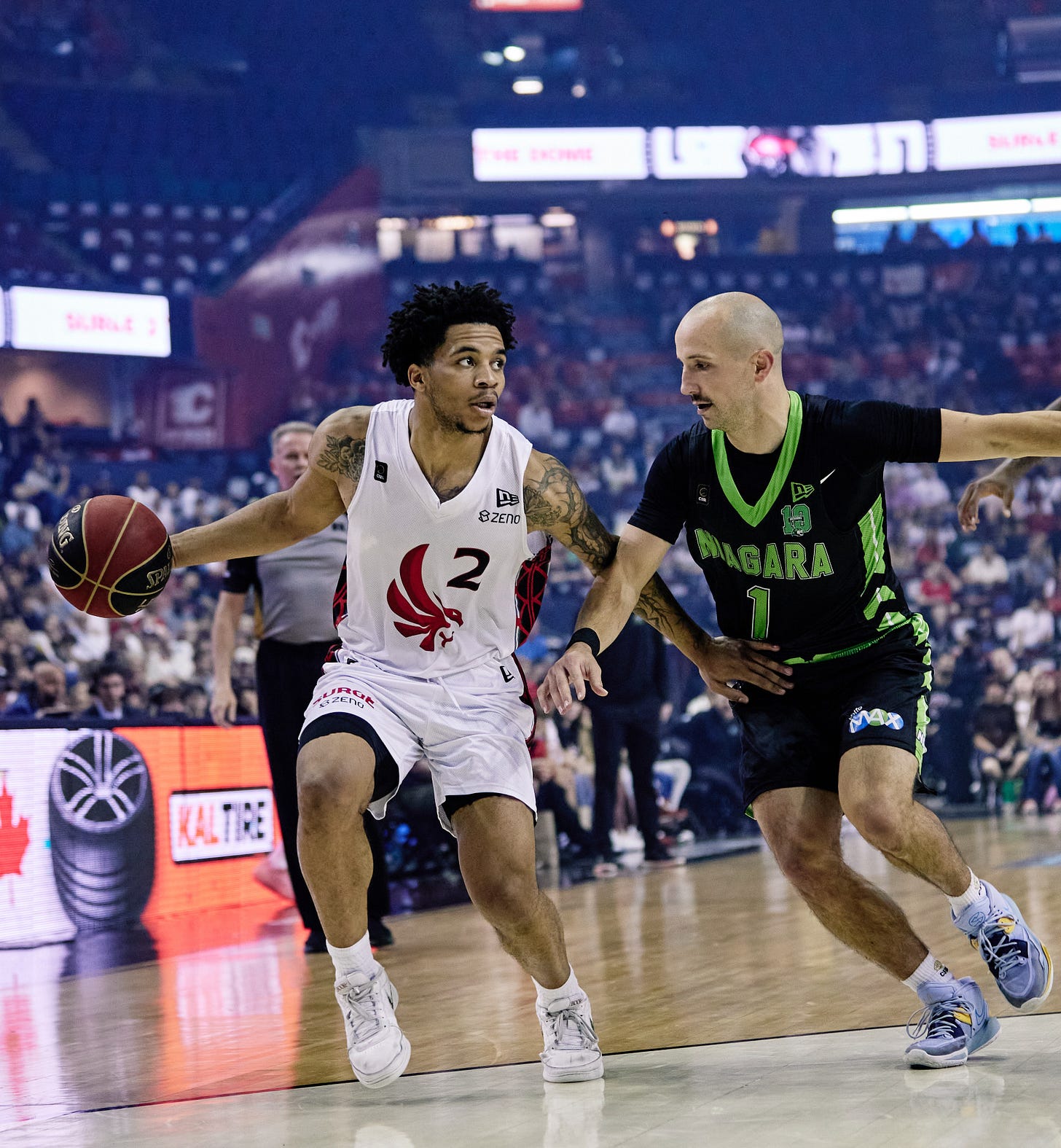 Jameer Nelson Jr. is guarded by Niagara’s Kimbal MacKenzie during August 10th’s season final at the Scotiabank Saddledome / Photo via CEBL
