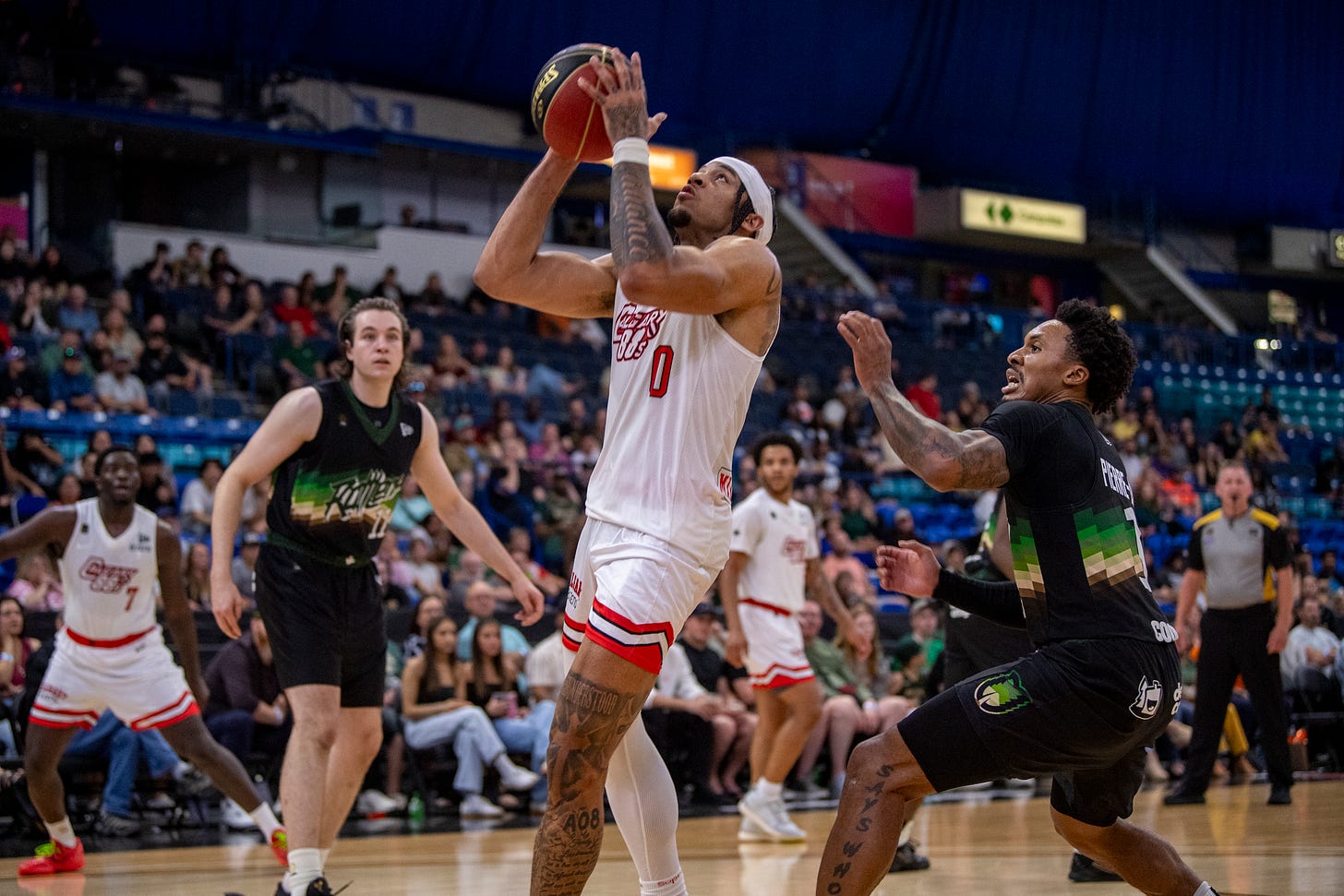 Sean “Rugzy” Miller-Moore goes up for a floater against the Saskatchewan Rattlers / Photo via CEBL